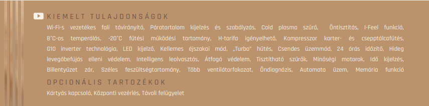 Felszerelés és beüzemelés díja bruttó 45.000 Ft, mely tartalmazza a kiszállást, a készülék helyszínre szállítását, a kültéri és beltéri egység felszerelését, elektromos betáp kiépítését aljzatba max. 5 méterig*, a kültéri tartókonzolt, rögzítő elemeket, a vákuumozást, a berendezés beüzemelését és azzal kapcsolatos dokumentumok kitöltését (pl.: beüzemelési jegyzőkönyv, garanciajegy...), valamint a takarítást.