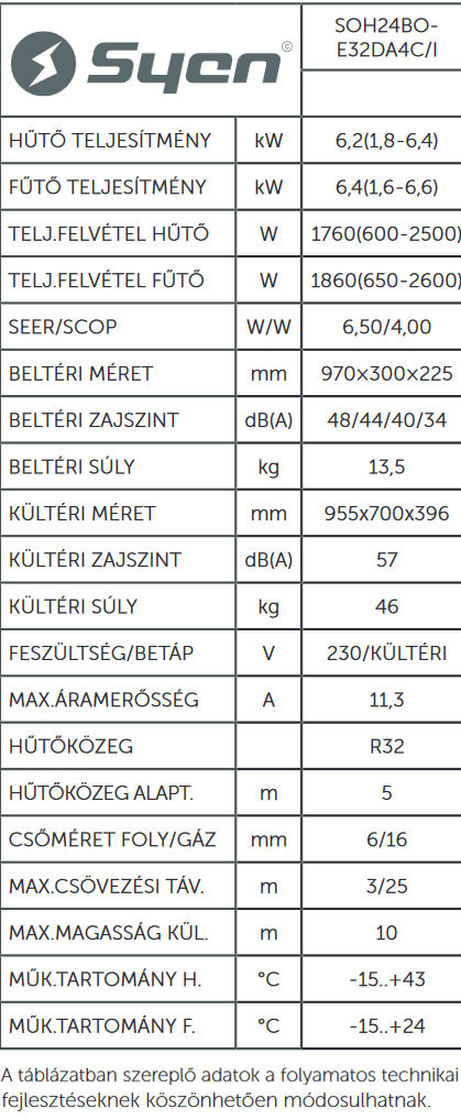 A Syen Bora Plus SOH24BO-E32DA4C Inverteres Split klíma fontos tulajdonságai: